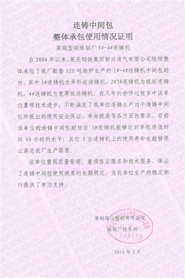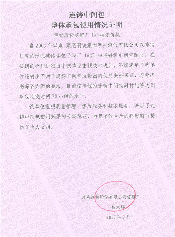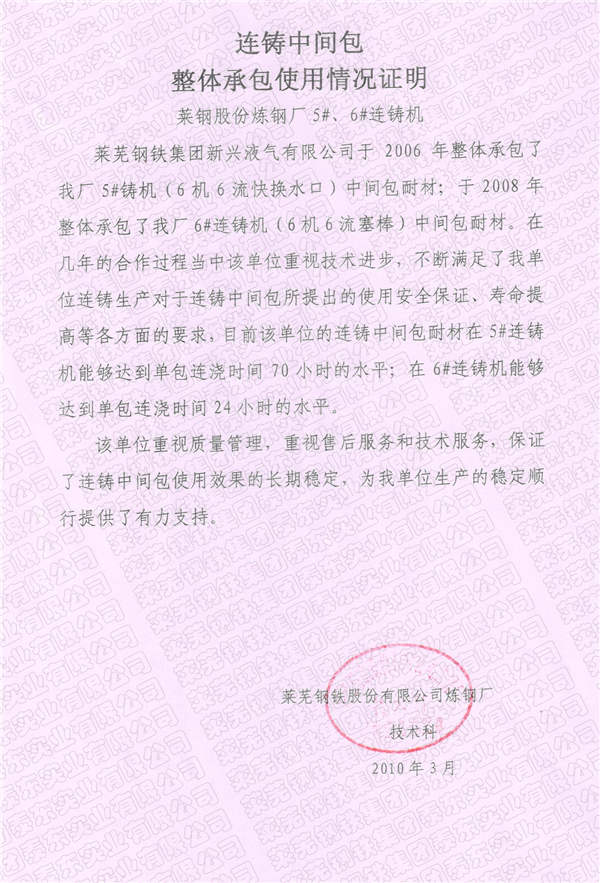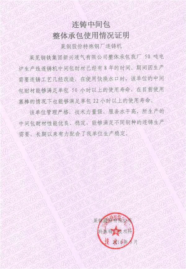 公司以雄厚的技術(shù)力量承擔(dān)著萊鋼全部12臺(tái)連鑄機(jī)中間包耐火材料的整體承包服務(wù),經(jīng)過(guò)多年的發(fā)展,公司已經(jīng)形成了對(duì)連鑄中間包耐火材料方案設(shè)計(jì)、生產(chǎn)、研發(fā)、現(xiàn)場(chǎng)施工及售后服務(wù)為一體的綜合體系。目前,在萊鋼中間包連拉爐數(shù)更是突破100小時(shí),達(dá)到國(guó)內(nèi)領(lǐng)先水平。